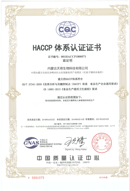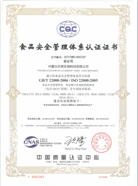 熱烈慶祝天奇生物天奇生物HACCP認證、ISO22000體系認證、FDA認證復審成功。天奇生物作為集多肽食品原料、現代食品和保健食品研發、生產和銷售為一體的現代化企業,對生產食品安全衛生質量控制、建立關鍵控制點對危害進行控制,消除食品安全危害,確保食品在消費的生產、加工、制造、準備和食用等過程中的安全等方面一直不懈努力并獲得中國質量認證中心的全面肯定。不僅致力于國內大健康產業的拓展和銷售,同時積極開拓海外市場獲得FDA認證,這也標志著天奇生物相關產品被相關部門認定,確保食品供應安全、干凈、新鮮并且標識清楚。注:(天奇生物自成立不久便獲得相關資質認證,此次為復審。)